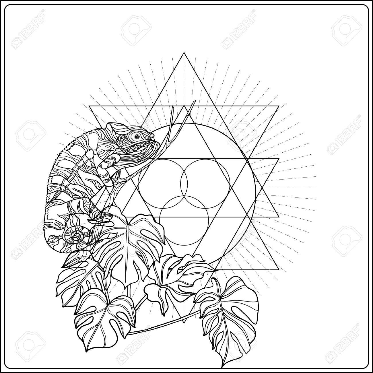 Les Animaux Et Les Plantes Tropicales Fond Avec Le Symbole De La Geometrie Sacree Dessin Au Trait Vector Illustration Bon Pour Adultes Livre De
