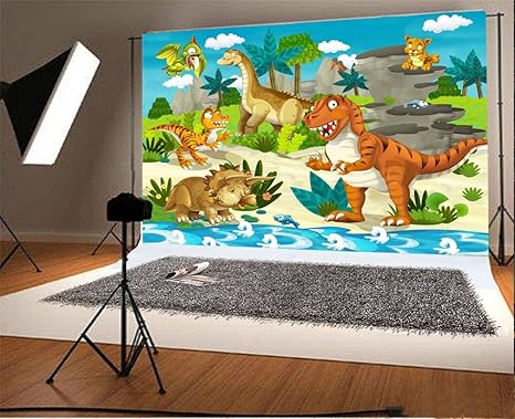 Yongfoto 1 5x1m Toile De Fond Dessin Anime Periode Jurassique Dinosaure Animaux Zoo Park Arbres Ciel Bleu Nuage Blanc Prairie Verte Anniversaire Fond