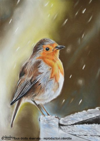 Dessin dun oiseau rouge gorge sous la neige realise au pastel sec sur pastel mat. Drawing of a red bird throat realized with pastel. Chelene roux ce quen disent les utilisateurs dessin dun oiseau rouge gorge sous la neige realise au pastel sec sur pastel mat.