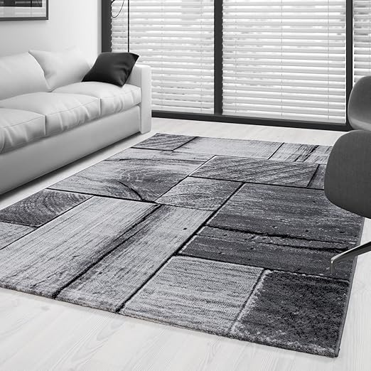 Simpex Tapis Dessin Moderne Damier Tas De Tronc D Arbre A Poils Courts Aspect Bois Noir Gris Taille 80x150 Cm
